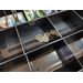 Корпус денежного ящика изготовлен из металла, а бокс для монет из высококачественного ударопрочного пластика ABS. Ячейки денежного ящика регулируются по размерам за счет съемных перегородок. Кассиры могут самостоятельно регулировать ячейки для удобства пользования в соответствии со своими предпочтениями. Отсеки под монеты расположены в два ряда, что удобно при большом количестве номиналов монет, а при необходимости в одном из рядов можно переставить перегородки для складывания купюр. Во фронтальной части ящика находиться две щели, которые позволяют складывать купюры больших номиналов и чеки при отплате кредитными картами, не открывая ящик. Щели имеют подложку, благодаря которой купюры не разлетаются по всему дну денежного ящика.